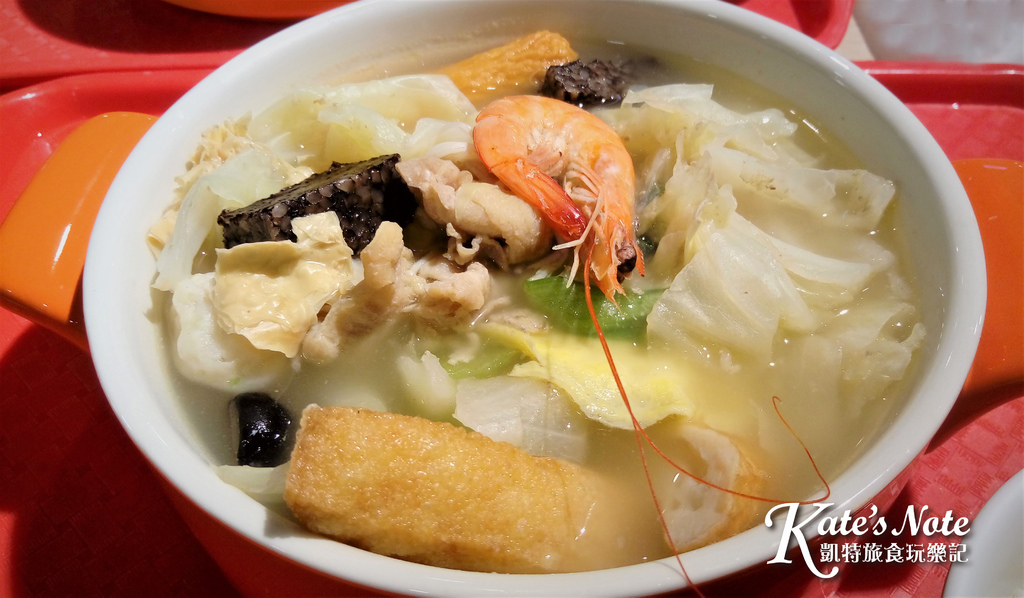 除了有雞肉的肉片以外,還有蝦子、蔬菜、火鍋料…等多樣配料,而湯頭偏清淡,更能吃出食物的原味。